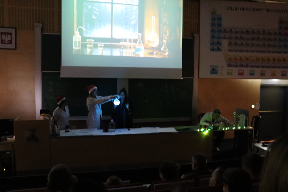 Centralnym punktem programu była świąteczna opowieść inspirowana „Opowieścią wigilijną” Charlesa Dickensa. Jej bohaterem był zrzędliwy i niezbyt przyjazny światu profesor chemii Ebenezer Schroodge, który początkowo nie wierzył ani w świąteczną atmosferę, ani w radość płynącą z dzielenia się wiedzą. W trakcie niezwykłej historii profesor przeżył serię zaskakujących wydarzeń, które – podobnie jak w klasycznej opowieści Dickensa – skłoniły go do refleksji i przemiany. Jak przystało na wigilijną opowieść, mimo pojawiających się trudności wszystko dobrze się skończyło, a finał historii wywołał uśmiechy i radość wśród uczestników.