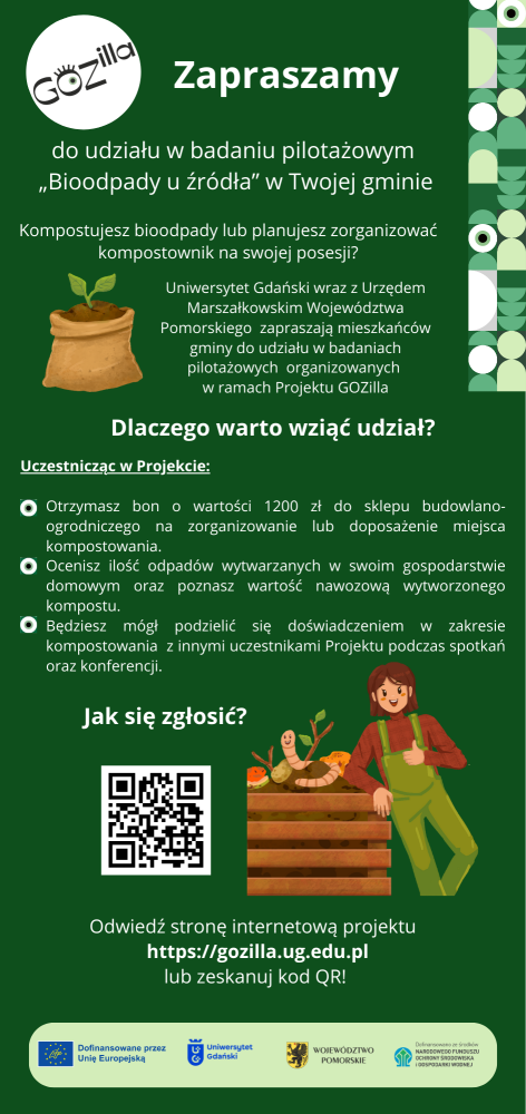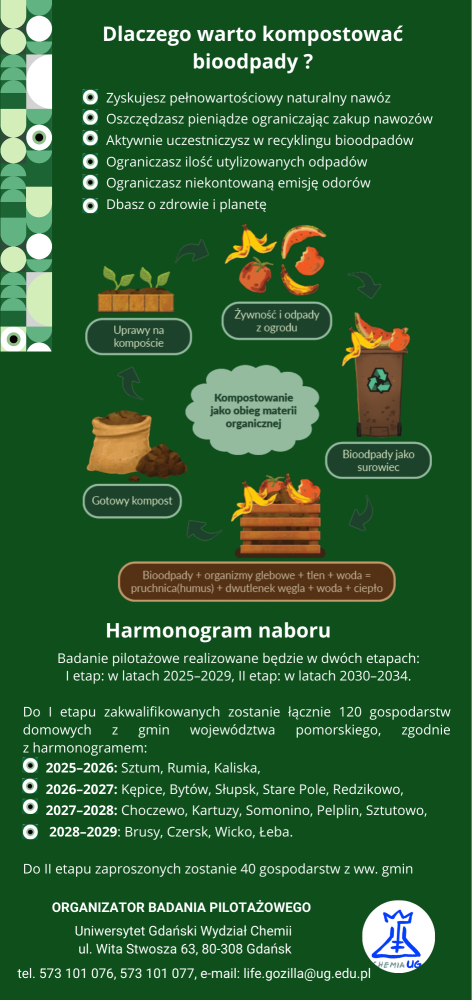 W ramach realizowanego na Wydziale Chemii projektu LIFE23-IPE-PL-LIFE Pom GOZilla.PL „Wdrożenie Planu Gospodarki Odpadami dla Województwa Pomorskiego (PGOWP) uwzględniającego hierarchię sposobów postępowania z odpadami komunalnymi oraz zasady gospodarki cyrkularnej (GOZ)” w styczniu br rozpoczęto badania pilotażowe „Bioodpady u źródła” z udziałem gospodarstw domowych z województwa pomorskiego. Obecnie w skład wydziałowego zespołu projektowego wchodzą prof. dr hab. Ewa Siedlecka (kierownik projektu z ramienia UG), dr Aleksandra Bielicka-Giełdoń (koordynator zadania), dr hab. Beata Grobelna, prof. UG, dr Justyna Samaszko-Fiertek oraz dr inż. Magda Kozak.